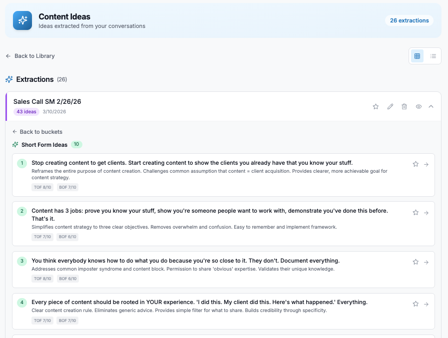 Upload an audio recording or paste a transcript. The AI analyzes the conversation, identifies key moments like problems your clients raised, solutions you offered, and insights that build trust, then ranks each idea by content potential.